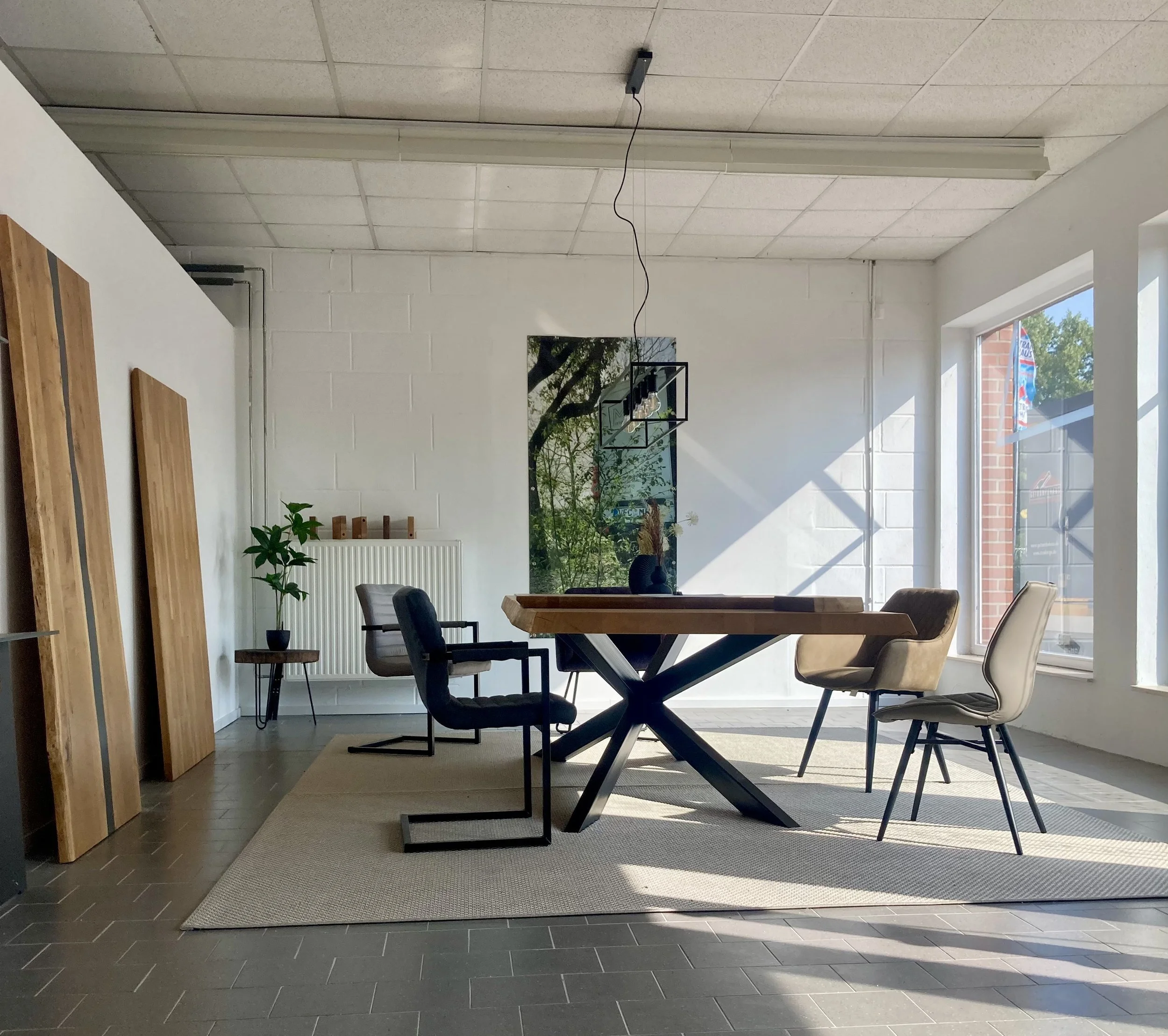 Wir produzieren handgefertigte Stahlgestelle und Massivholzplatten in Dammensia.